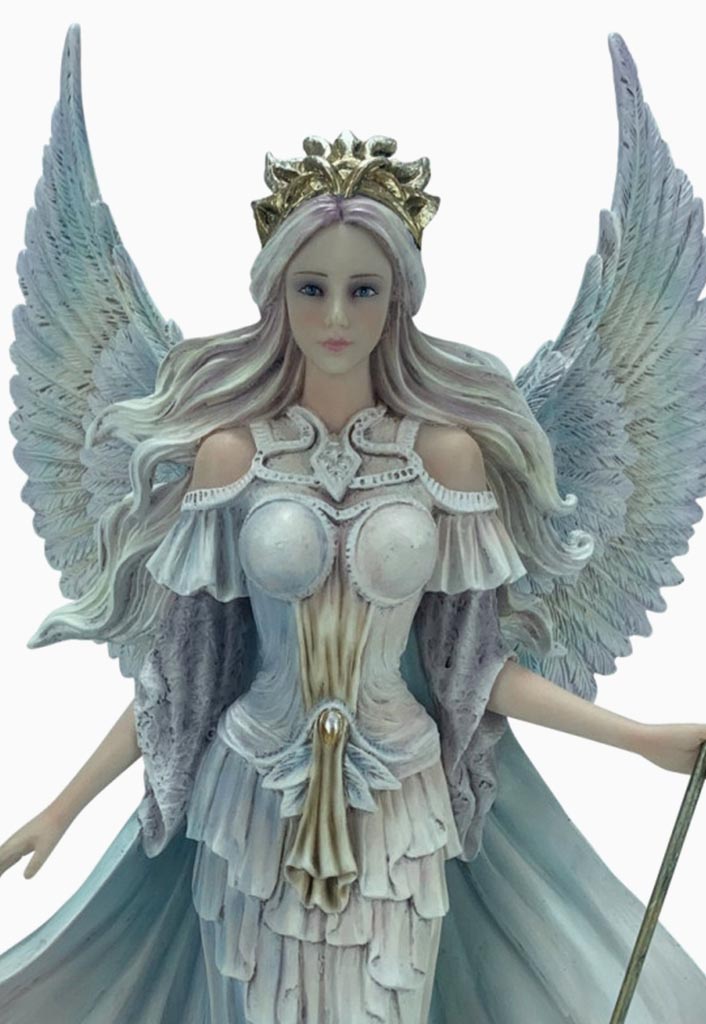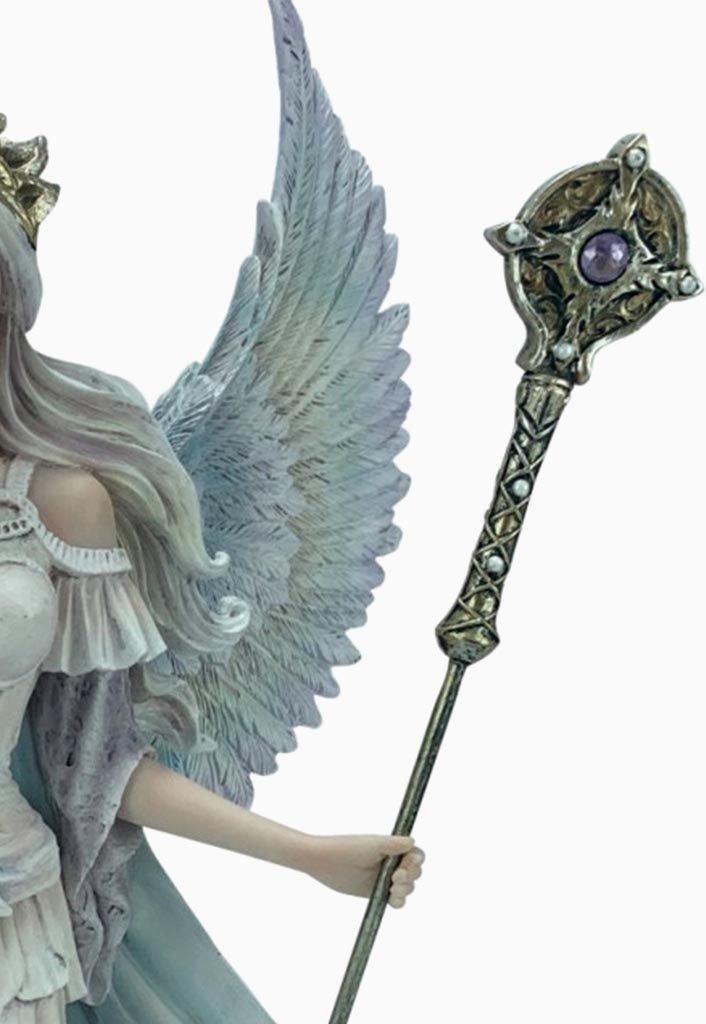 Figura del Ángel Hera de 23×37.5 cm, fabricada en resina y pintada a mano. Con tonos angelicales blancos, dorados y azulados, lleva una vara y una corona dorada que simbolizan su conexión divina y gracia celestial.