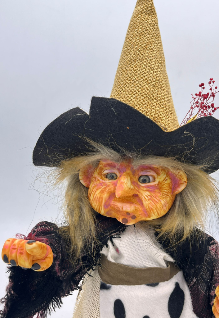 Trisca no es una brujita cualquiera. Con su mirada despierta, su atuendo lleno de contrastes y su bastón natural, parece estar siempre a punto de lanzar un hechizo inesperado… o de meterse en alguna pequeña travesura.