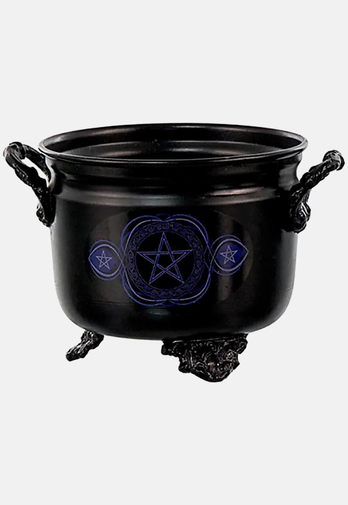Los calderos de brujas suelen estar decorados con símbolos paganos, como la Triquetra, las fases de la Luna, nudos celtas y el Árbol de la Vida, todos ellos representando la sabiduría de la naturaleza y la conexión con lo divino. El Pentagrama, que simboliza los cinco elementos (fuego, agua, tierra, aire y espíritu), también se encuentra a menudo en estos calderos.