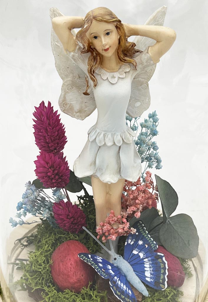 Sumérgete en un mundo de magia y encanto con nuestra cautivadora cúpula de cristal con luz LED. En su interior, una hermosa figura de hada en tonos azulados, con sus brazos en posición de relax. Esta encantadora escena se encuentra rodeada por un exuberante bosque floral, adornado con flores secas y preservadas que añaden un toque de naturalidad y belleza. Una mariposa en tonos azules revolotea entre las flores, añadiendo un toque de vitalidad y color.