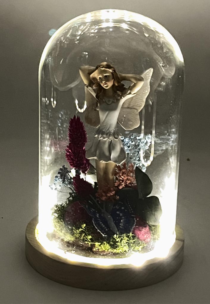 Esta hada con cúpula es el complemento perfecto para cualquier espacio, ya sea como pieza decorativa en tu hogar o como un regalo único y memorable para alguien especial. La suave iluminación LED que emana de su base realza aún más la magia de esta escena, creando una atmósfera cálida y acogedora.