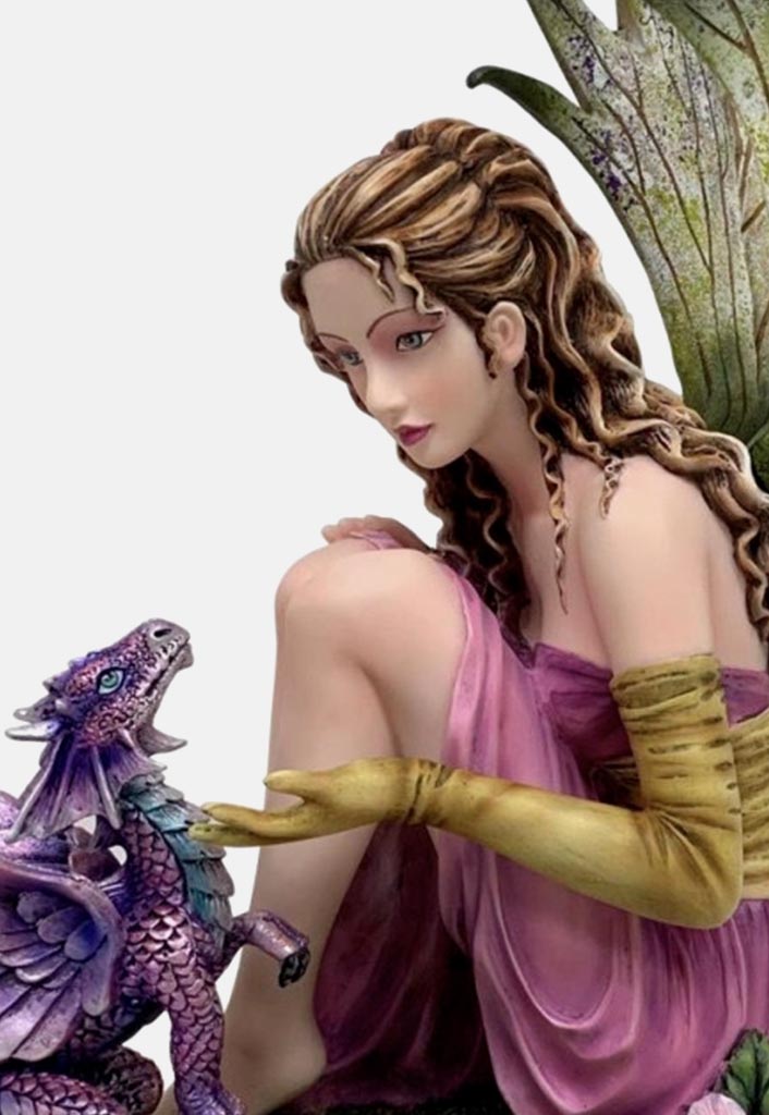 En nuestra tienda online, te invitamos a descubrir la suerte y la magia con nuestra cautivadora figura, «Hada de la Suerte Tessan». Con unas medidas de aproximadamente 30×35 cm, esta hermosa hada de pelo rizado se encuentra sentada junto a un pequeño dragón de color violeta, rodeada de flores rosas. La escena representa la magia, la belleza y el compañerismo con su dragón en perfecta armonía.
