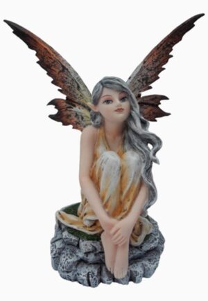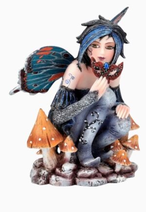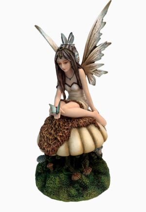 Hada Yosum, una hada del bosque sentada sobre un tronco con setas, lleva un vestido en tonos verdes y marrones, con detalles de cuero y un tatuaje de tela de araña. Sus alas en tonos cremosos y marrones completan su apariencia mística. Medidas: 15 cm aprox.