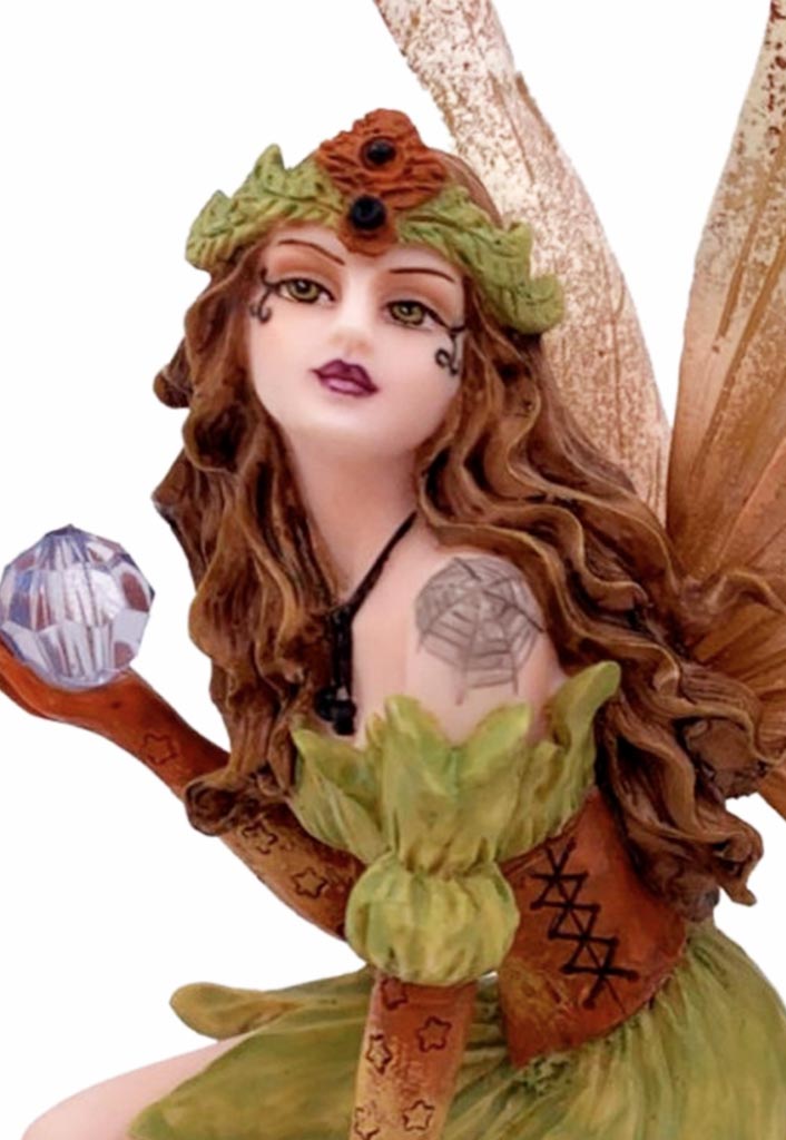 Hada Yosum, una hada del bosque sentada sobre un tronco con setas, lleva un vestido en tonos verdes y marrones, con detalles de cuero y un tatuaje de tela de araña. Sus alas en tonos cremosos y marrones completan su apariencia mística. Medidas: 15 cm aprox.