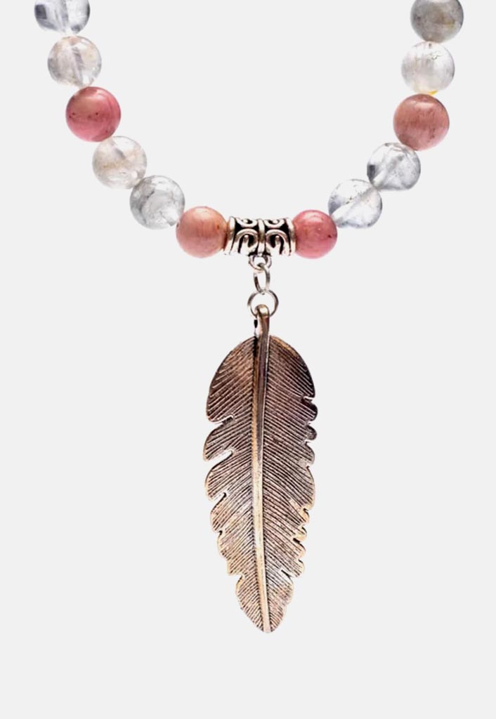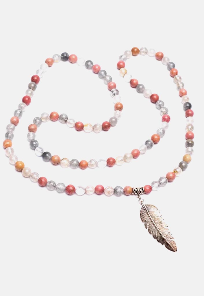 «Japa Mala de rodonita y cuarzo gris con colgante de pluma» – Perfecto para las practicas meditativas.