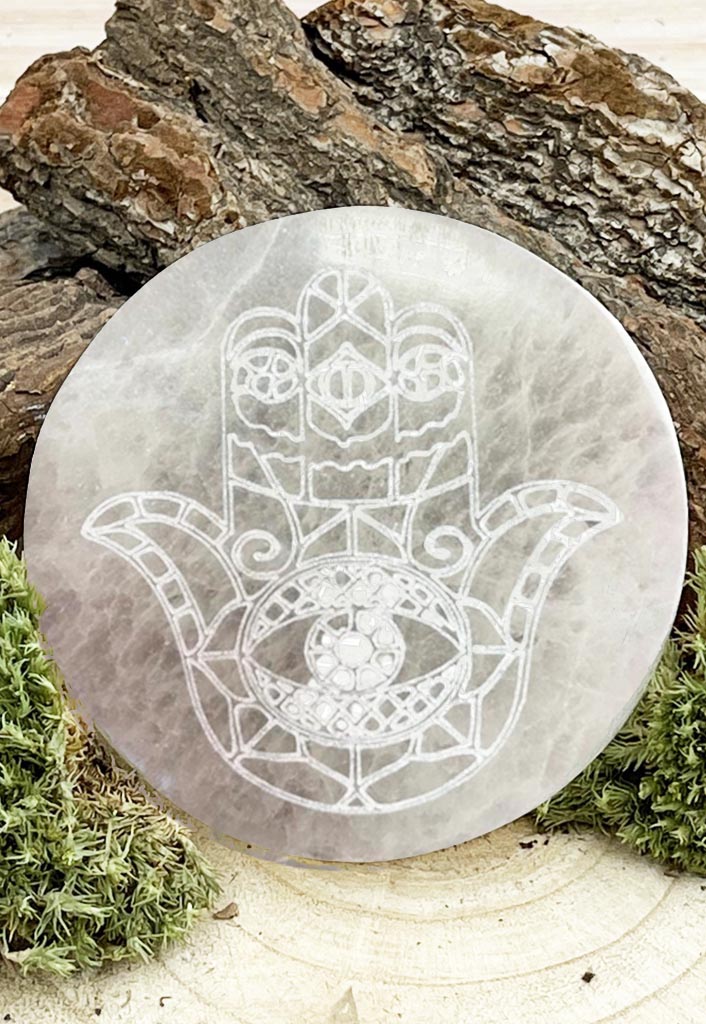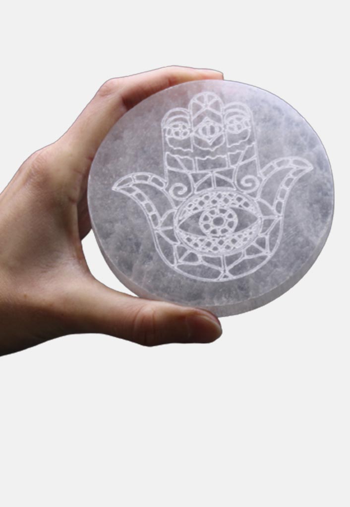 Utiliza la Placa de carga de selenita 10cm «Hamsa» para limpiar y recargar tus minerales y gemas. Con nuestra placa de selenita, puedes colocar la piedra afectada encima durante la noche para rejuvenecer su energía.